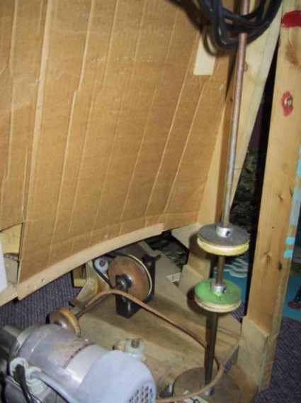 So! Ein Blick in die Innereien. Denn das Beste habe ich bis jetzt verschwiegen. Die meisten Teile bewegen sich! Das Riesenrad, alle Karussells und auch die Wippe! Angetrieben wird dies über einen Motor der über Keilriemen und Stangen die einzelnen Teile in Bewegung versetzt.